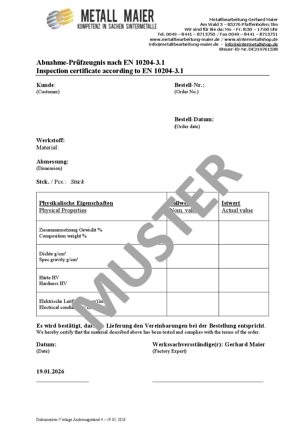 Werkzeugnis – Abnahme-Prüfzeugnis nach EN 10204-3.1
